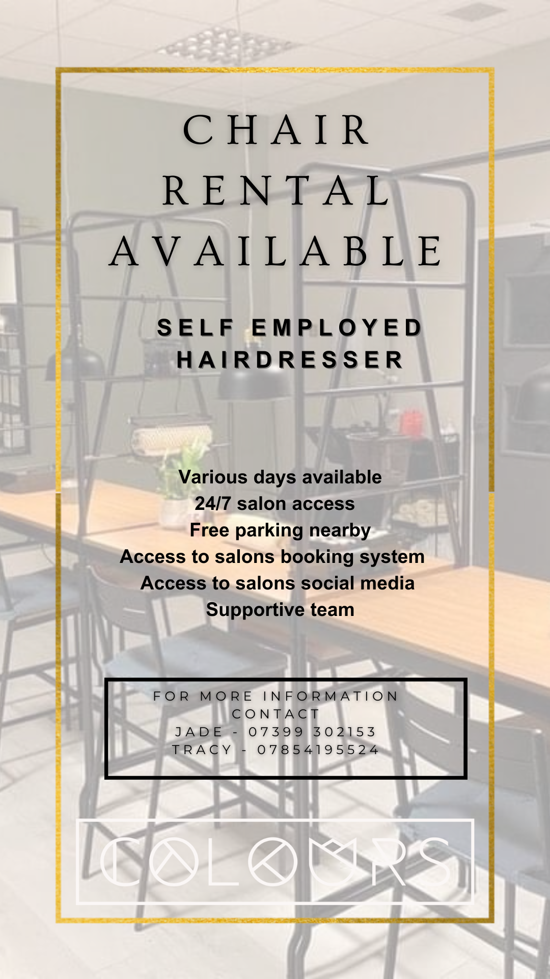 Hairdressing chairs to rent in independent salon near Old Street / Barbican / Angel